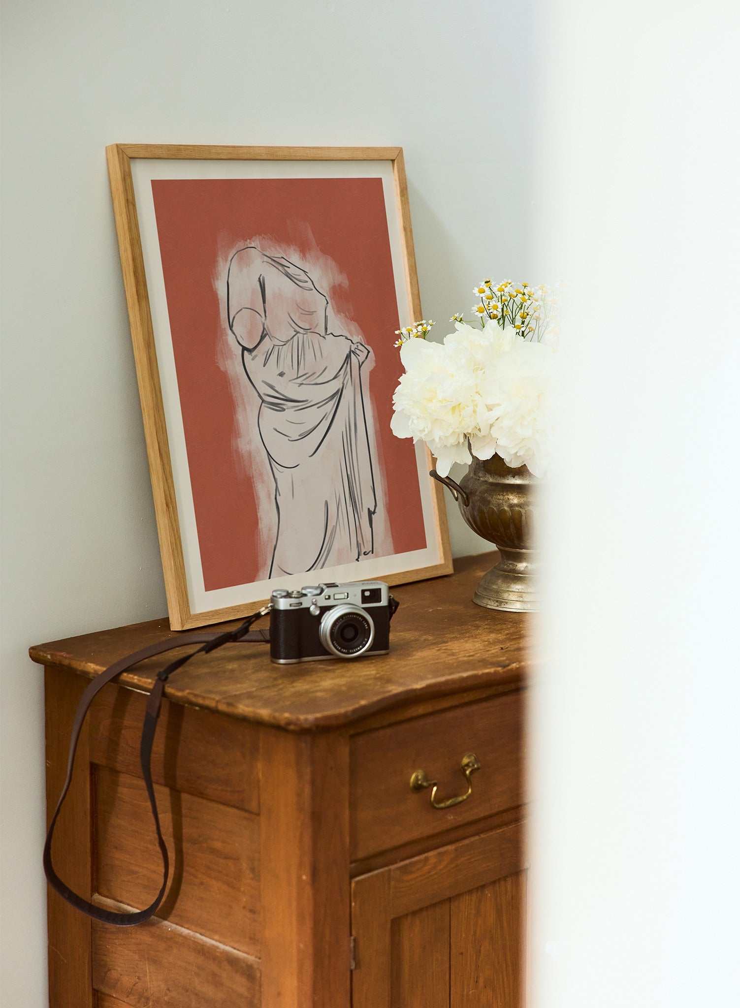 This art print captures a gestural sketch of a fragmented classical statue, mid-drape and headless, drawn in sweeping black lines over a soft blush ground. The figure’s twisting posture and flowing robes echo the elegance of Greco-Roman sculpture, while the unfinished contours and loosely painted strokes offer a distinctly modern lens. Set against a sunbaked terracotta backdrop, the silhouette feels like a sun-faded memory of a museum relic—or something glimpsed in the corner of an Italian piazza at golden hour.