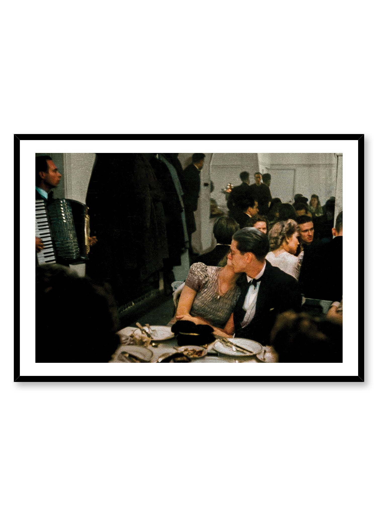 This vintage photograph captures a couple in an intimate moment at a bustling restaurant. Leaning closely together, their faces nearly touching, they are lost in each other, seemingly unaware of the lively scene, which includes an accordion player and other diners. The image feels like a treasured frame from a forgotten film or a cherished personal memory, celebrating connection.